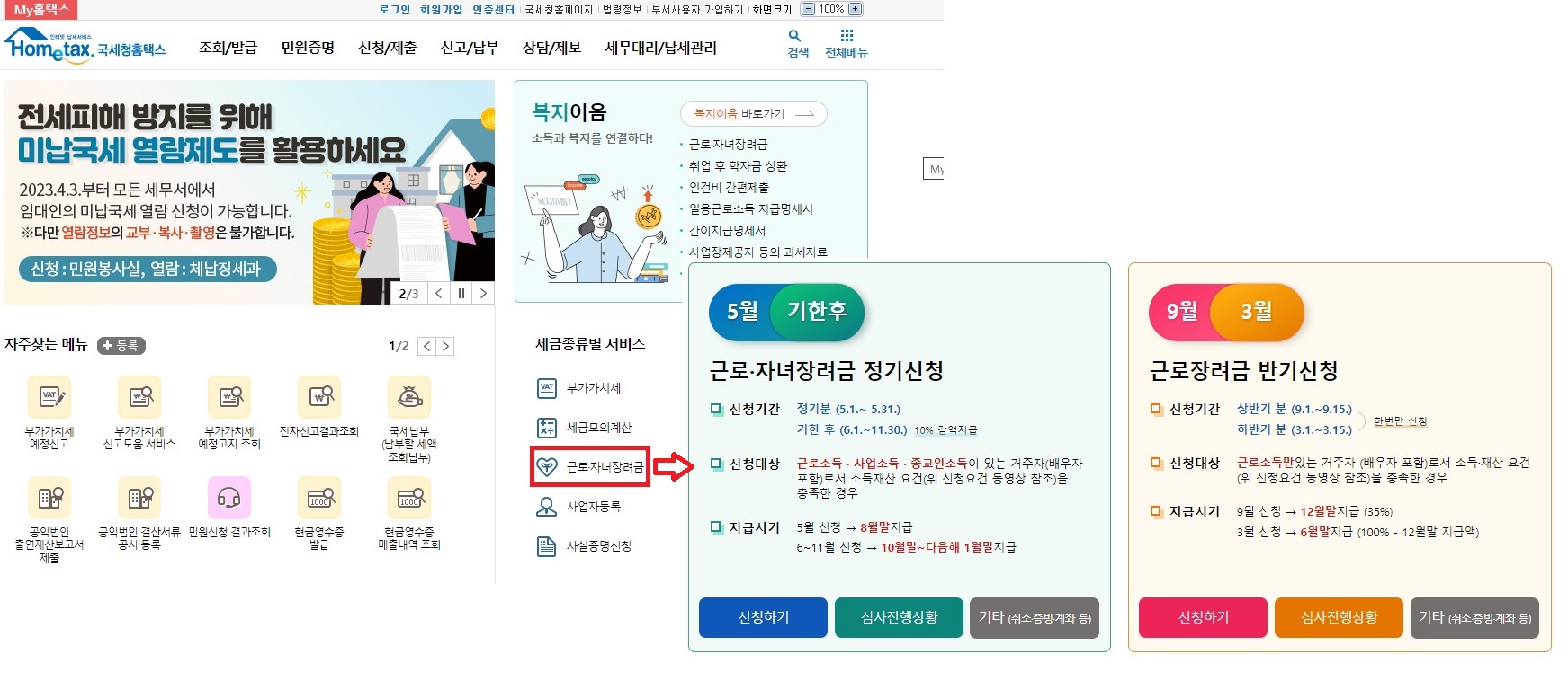 대상자에게 서면이나 모바일로 안내문이 발송이 되지만, 혹시 안내문을 받지 못한 경우에는 웹사이트나 모바일앱에 접속하시면 대상자 확인 후 신청하시면 됩니다. 인터넷 홈페이지(홈택스)나 모바일 앱(손택스)에 접속하여 '근로·자녀장려금' 항목에서 신청하시면 됩니다.